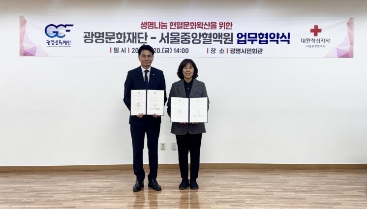 [ 타임즈 - 김시창 기자 ] (재)광명문화재단(대표이사 송은영)은 서울중앙혈액원(원장 이재용)과 함께 2월 20일 오후 2시에 광명시민회관에서 '헌혈자 대상 문화예술 프로그램 제공 및 헌혈 문화 정착을 위한 업무협약'을 체결했다고 밝혔다.