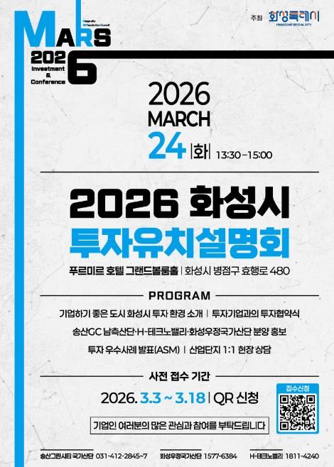 [ 타임즈 - 김시창 기자 ] 화성특례시가 오는 3월 24일 푸르미르 호텔에서 ‘2026 화성특례시 투자유치 설명회’를 개최하고, 3월 3일부터 3월 18일까지 QR코드를 통한 사전접수를 진행한다.