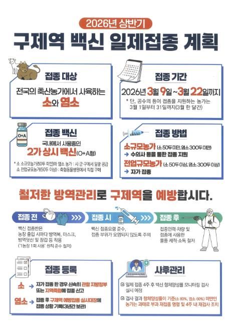 [ 타임즈 - 김시창 기자 ] 홍천군은 구제역 유입 방지와 완전 차단을 위해 상반기 구제역 일제 백신접종을 실시한다. 대상은 1,001 농가 36,830두(소 928 농가 33,566두, 염소 73 농가 3,264두) 사육 농가이다.