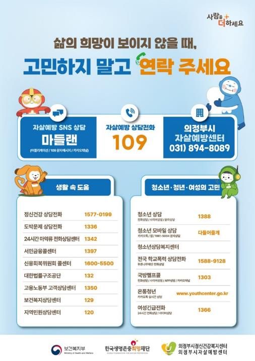 [ 타임즈 - 김시창 기자 ] 의정부시 보건소는 봄철 자살률이 증가하는 자살 고위험 시기(3~5월)를 맞아 시민의 생명을 보호하고 정신 건강 인식을 높이기 위한 자살 예방 집중 홍보 활동을 실시한다.