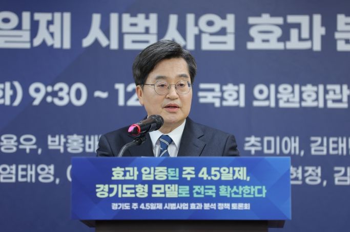 김동연 경기도지사는 10일 국회 의원회관 제3세미나실에서 열린 ‘주4.5일제 시범사업 효과분석 정책 토론회’에 참석해 “주4.5일제는 단순히 근무시간을 줄이는 정책이 아니다”라며 “일하는 방식과 삶의 균형을 새롭게 설계하자는 사회적인 실험”이라고 강조했다.