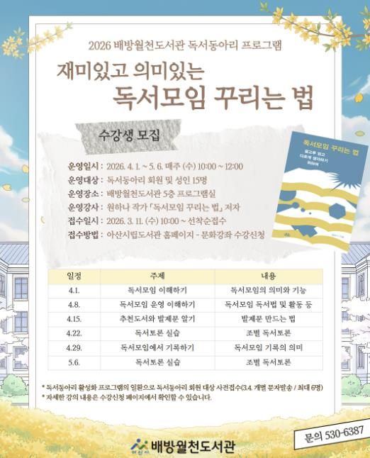 강의는 『독서모임 꾸리는 법』의 저자인 원하나 작가가 맡아 진행하며, 4월 1일부터 5월 6일까지 매주 수요일 오전 10시 배방월천도서관 5층 프로그램실에서 총 6회 과정으로 운영된다.