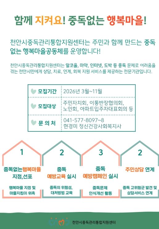 [ 타임즈 - 김시창 기자 ] 천안시중독관리통합지원센터는 올해 ‘함께 지켜요! 중독없는 행복마을’ 사업을 확대 추진한다고 11일 밝혔다.