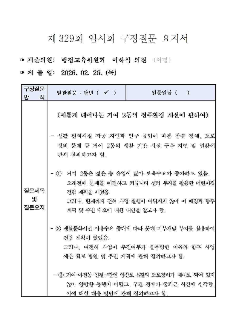 제329회 송파구의회 임시회 이하식 의원 구정질문 요지서
