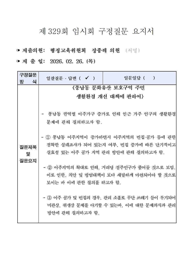 제329회 송파구의회 임시회 정종례 의원 구정질문 요지서