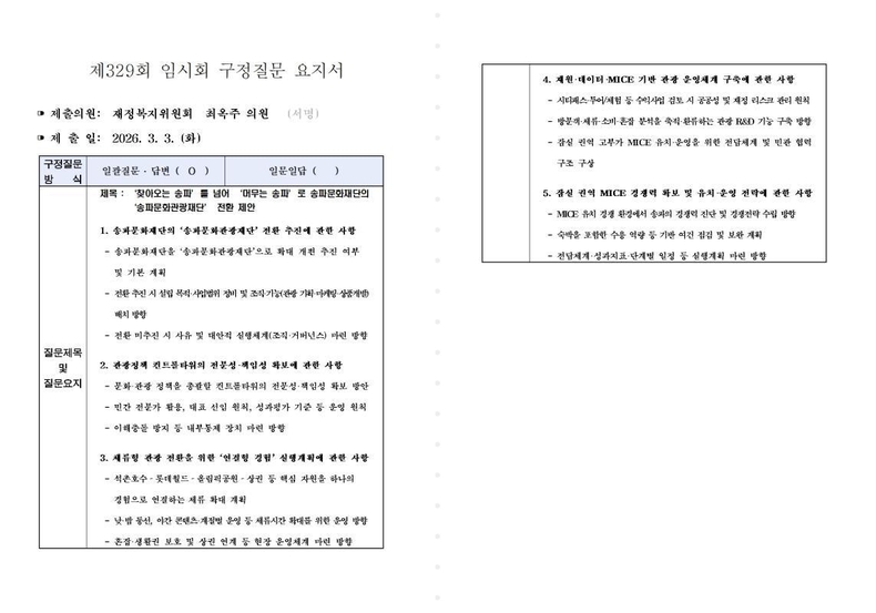 제329회 송파구의회 임시회 최옥주 의원 구정질문 요지서