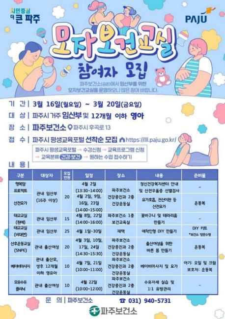 [ 타임즈 - 김시창 기자 ] 파주보건소는 건강한 임신과 출산, 행복한 육아를 지원하기 위해 4월부터 운영하는 ‘모자보건 프로그램’참여자를 모집한다.