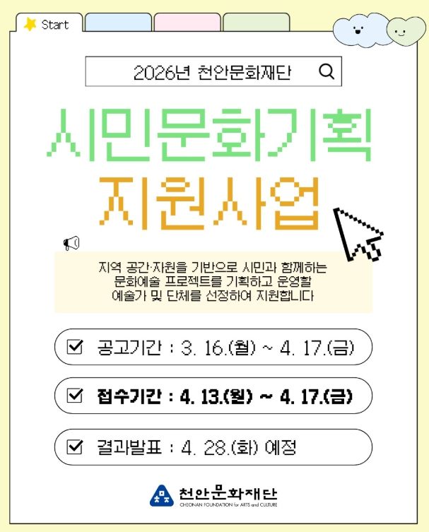 [ 타임즈 - 김시창 기자 ] 천안문화재단은 내달 13~ 17일 ‘시민문화기획 지원사업’ 참여 예술가를 모집한다고 16일 밝혔다.