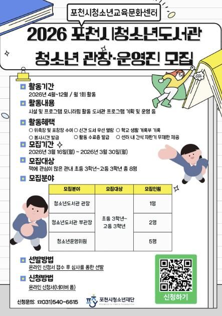 [ 타임즈 - 김시창 기자 ] 포천시청소년재단 포천시청소년교육문화센터는 청소년 참여형 도서관 운영을 위해 ‘2026년 포천시청소년도서관 청소년 관장 및 운영진’을 모집한다.