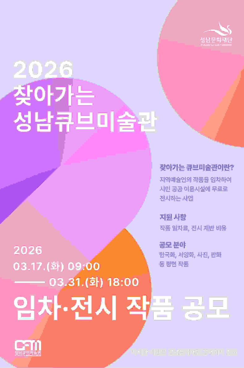 [ 타임즈 - 김시창 기자 ] 성남문화재단(대표이사 윤정국)은 지역예술인의 창작 환경 지원을 다각화하고 시민들의 문화예술 향유기회를 확대하고자 ‘2026 찾아가는 성남큐브미술관’ 작품 임차 공모를 진행한다.