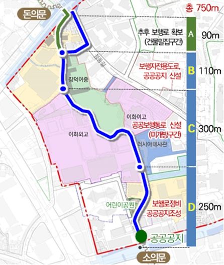 해설의 시작은 돈의문박물관마을에서 출발해서, 돈의문터를 거쳐 도성 성벽유구가 남아있는 창덕여중과 이화여고 교정을 지나 도성의 정문인 숭례문에서 마무리된다. 도성의 흔적을 따라 걷는데 소요되는 시간은 1시간30분이며, 초등학생 참가자에게는 돈의문의 옛 모습을 입체사진으로 볼 수 있는 ‘돈의문 입체경 만들기 세트’가 제공된다.