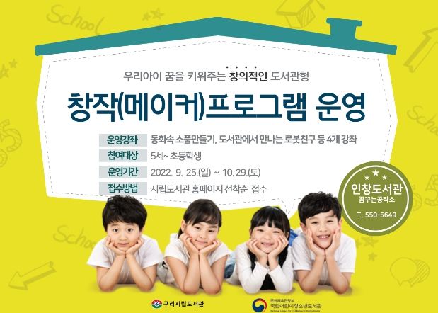 타임즈 김시창 기자 | 구리시 인창도서관이 국립어린이청소년도서관 주관 메이커 관련 공모사업인 ‘미꿈소 네이밍 브랜드화 사업’과 ‘이야기가 있는 코딩’ 등 2개 분야에 선정되어 9월 25일부터 꿈꾸는 공작소에서 다양한 체험형 메이킹 프로그램을 운영한다고 밝혔다.