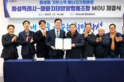 [ 타임즈 - 김시창 기자 ] 화성특례시는 16일 시청 중앙회의실에서 마파지태양광협동조합과 ‘화성형 기본소득 에너지자립마을 조성을 위한 업무협약(MOU)’을 체결했다. 이날 협약식에는 정명근 화성특례시장을 비롯해 김진원 마파지태양광 협동조합장 등이 참석해, 주민주도형 재생에너지 기반 에너지자립마을 조성사업의 추진에 상호 협력하기로 했다. 이번 사업은 국유지를 활용해 주민이 사업비 전액을 부담해 100% 주민주도형 ‘에너지자립마을’을 조성하는 경기도 최초 사례로, 재생에너지 수익을 마을 복지와 기본소득으로 연계하는 ‘화성형 기본사회’ 정책의 첫 시범 모델이다. 마파지태양광협동조합은 석포6리 주민 25가구가 공동 운영하는 협동조합으로, 사업주체로서 장안면 석포리 823번지 제방 국유지에 415kW 규모의 태양광 발전설비를 설치한다. 사업비는 총 5억 2천만 원으로 전액을 주민이 자부담한다. 시는 협약에 따라 인허가, 관계기관 협의, 제도 검토 등 사업 추진에 필요한 행정적·제도적 지원을 담당하고, 에너지자립마을이 안정적으로 운영될 수 있도록 정책적 기반 마련에 협력한다. 또한 재생에너지 수