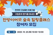 [ 타임즈 - 김시창 기자 ] 파주보건소는 시민들의 건강한 삶을 위한 한의약 건강 증진 프로그램인 ‘한방이어락(樂) 숲속 치유교실(힐링 클래스)’을 오는 25일 10시부터 12시까지 율곡수목원에서 운영한다. 이번 프로그램은 자연 속에서 가족이 함께 건강을 되돌아보고, 숲에서의 명상과 호흡을 통해 스트레스를 해소하고자 기획됐다. 참가자들은 수목원의 맑은 공기와 아름다운 풍경 속에서 지친 몸과 마음을 회복하는 시간을 갖게 된다. 주요 내용은 ▲구절초 숲길 산책 ▲자연 속에서 가족과 추억 만들기 ▲구절초 차 마시기 등 구절초를 주제로 한 다양한 활동으로 구성되어 있다. 신청은 파주시 평생교육포털 누리집(lll.paju.go.kr)을 통해 가능하며, 가족 단위로(4~6가구, 총 20여 명) 선착순 모집한다. 단, 신청 가구가 많을 경우 3대 가족을 우선 선발한다. 이한상 파주보건소장은 “자연과 함께하는 치유 프로그램을 통해 가족 간 유대감을 높이고, 건강한 생활 습관을 기를 수 있는 계기가 되길 바란다”라며 “많은 시민들의 적극적인 참여를 기대한다”라고 밝혔다.