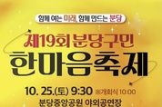 [ 타임즈 - 김시창 기자 ] ‘제19회 분당구민 한마음 축제’가 오는 10월 25일 오전 9시 30분~오후 1시 중앙공원 야외공연장에서 열린다. 성남시 분당구가 후원하고 분당구민 한마음 축제 추진위원회(위원장 김성민)가 주최해 열리는 이번 행사는 지역사회 화합 분위기를 조성하고자 ‘함께 여는 미래, 함께 만드는 분당’을 주제로 진행된다. 이날 성남시립합창단과 시민 예술단 아인스바움의 공연으로 축제의 화려한 막을 연다. 이어 수내3동, 정자3동, 야탑1동, 백현동 주민자치센터 문화 프로그램에 참여 중인 4개 팀이 난타, 한국무용, 줌바, 에어로빅 등 흥겨운 공연으로 중앙무대를 꾸민다. 초청 가수 김용필(미스터트롯2 출신)의 ‘오히려 좋아’, ‘낭만의 계절’, 바이올리니스트 백진주와 소프라노 유경진이 듀엣으로 연주하는 영화음악(OST) ‘캐리비안의 해적’, ‘대부’, 성남청년프로예술단의 댄스 공연도 열려 축제 분위기를 달군다. 중앙공원 황새울광장에는 배틀 로봇, 4족 보행 로봇 등 6개의 4차산업 체험존, 시민 체험용 드론 축구존, 추억의 사진관을 차려 운영한다. 장애인 복합사업장인 굿윌스토어 물품을 판매해 수익금을 저소득 가정에 후원하는 ‘희망나눔 온마켓’도