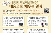 [ 타임즈 - 김시창 기자 ] 용인특례시는 25일부터 26일까지 수지구에 있는 용인시 평생학습관에서 특별강좌 수강생을 모집한다고 17일 밝혔다. 이번 특별강좌는 4주 과정으로, 시민의 수요를 반영해 실생활에 도움이 되는 다양한 강좌로 구성됐다. 총 8개 강좌를 운영하며 112명의 수강생을 모집한다. 주요 프로그램은 ▲인문교양 분야(K-세계유산, 현장에서 멋보기) ▲뷰티 분야(체형 진단 패션스타일 찾기) ▲정보화 분야(디지털 사진 입문: 스마트폰으로 배우기) ▲조리 분야(우리 집 김치 만들기) ▲문화예술 분야(쉽고 편한 보컬 발성법 야간) 등이다. 교육은 3월 30일부터 4월 24일까지 진행되며 만 19세 이상 용인시민이라면 누구나 신청할 수 있다. 용인에 주소를 둔 재외국민, 결혼이민자, 용인 소재 기업에 재직 중인 직장인도 참여 가능하다. 접수는 용인시 평생학습관 누리집을 통해 선착순으로 진행된다. 수강료는 강좌별 수업 시간에 따라 1만 원에서 1만 5000원이며, 재료비는 별도로 개인이 부담한다. 시 관계자는 “시민이 배움의 가치를 느낄 수 있도록 실생활에