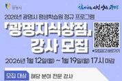 [ 타임즈 - 김시창 기자 ] 광명시 평생학습원이 시민 맞춤형 평생학습 프로그램 ‘광명지식상점’을 운영할 2026년도 전문 교육 강사를 공개 모집한다. ‘광명지식상점’은 시민의 삶과 밀접한 주제를 중심으로 배움과 성장을 지원하는 광명시 대표 평생학습 프로그램이다. 2026년에는 ▲미래기술 ▲직무역량 ▲재무설계 ▲인문성찰 ▲관계학습 ▲시민학습 ▲기타 제안과정 등 7개 분야에서 강사를 선발해 시민들에게 다채로운 교육 서비스를 제공할 예정이다. 지원 자격은 해당 모집 분야의 전문성을 보유하고 관련 자격증과 실무경력을 모두 갖춘 자에 한한다. 시는 강의 경력, 강의계획서, 자기소개서 등을 바탕으로 1차 서류심사를 진행한 뒤, 수업 시연과 질의응답으로 구성된 2차 면접심사를 거쳐 최종 40여 명의 강사를 선발할 계획이다. 접수는 오는 12일부터 19일 17시까지 이메일 또는 평생학습원 2층 사무실 방문을 통해 가능하다. 제출 서류 등 세부 사항은 광명시 평생학습플랫폼 ‘광명이(e)지’ 공지사항에서 확인할 수 있다. 최종 합격자는 2월 중 ‘광명e지’에서 발표하며, 선발된 강사진은 3월부터 본격적