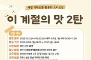 [ 타임즈 - 김시창 기자 ] 원주시 동부복합생활지원센터는 오는 11월 3일부터 ‘이 계절의 맛 2탄’ 건강 요리 교실 프로그램 참여자를 모집한다. 이번 프로그램은 제철 식재료를 활용해 면역력과 활력을 높이는 건강 요리 실습을 통해 지역 주민들의 건강하고 균형 잡힌 식습관 형성을 돕는다. 교육은 11월 12일부터 12월 3일까지 매주 수요일마다 총 4회에 걸쳐 영양교육 및 요리 실습이 열린다. 프로그램은 오전 10시 30분부터 11시 30분까지 한 시간 동안 진행된다. 모집 인원은 20명이며, 11월 3일 오전 9시부터 11월 7일(금)까지 선착순 모집한다.