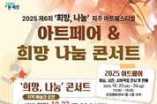 [ 타임즈 - 김시창 기자 ] 파주시가 주최하고 ㈔한국예술문화단체총연합회 파주지회에서 주관하는 '2025 제6회 ‘희망, 나눔’ 파주 아트페스티벌'이 10월 22일부터 24일까지 3일간 운정행복센터에서 개최된다. 올해로 6회를 맞이한 이번 축제는 다양한 분야의 예술을 매개로 온정을 나누고 희망과 행복을 전하기 위해 마련됐으며, 축제를 통해 발생한 수익금은 어려운 이웃에게 전달되고 있다. 축제 기간 동안 운정행복센터에 파주예총 전문 예술인들의 미술, 사진, 시화 작품 등을 전시하고 판매하는 공간이 운영되며, 23일과 24일에는 지역 예술인 및 초청 가수(전원석, 이규석, 녹색지대)들의 공연 ‘희망, 나눔 콘서트’가 개최된다. 공연 시작 전에는 무료로 가족사진 찍어주기 행사가 진행될 예정이다. 유초자 문화예술과장은 “이번 축제가 어려운 환경에 있는 이웃에게 나눔을 전하는 계기가 되기를 소망한다”라며, “일상 속에서 예술을 가까이 만날 수 있는 이번 축제에 시민 여러분의 많은 관심과 참여를 바란다”라고 말했다.