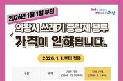 [ 타임즈 - 김시창 기자 ] 의왕시가 물가 상승 및 경기 침체로 인한 시민들의 경제적 부담을 완화하기 위해 2026년 1월 1일부터 쓰레기 종량제봉투 판매가격을 인하한다. 이번 가격 인하 대상은 일반용 및 재사용 종량제봉투이며, ▲5리터 봉투는 190원에서 150원으로 ▲10리터 봉투는 350원에서 300원으로 ▲20리터 봉투는 680원에서 550원으로 인하된다. 또한, ▲50리터 봉투는 1,700원에서 1,400원으로 ▲75리터 봉투는 2,630원에서 2,100원으로 각각 조정된다. 가격 인하 이전에 구매한 종량제봉투는 그대로 사용 가능하고, 음식물 종량제봉투, 공사장 생활폐기물 포대, 대형폐기물 신고필증은 가격 등은 변동 없다. 김성제 시장은 “종량제봉투는 시민 생활과 밀접한 만큼, 이번 가격 인하가 가계 부담 완화에 도움이 되길 바란다”며, “가격 인하 시점이 2026년 1월 1일이므로, 그전까지 각 가정에서 필요한 양만 구입해 주시길 바란다”고 전했다.