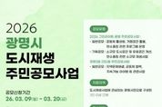 [ 타임즈 - 김시창 기자 ] 광명시가 오는 20일까지 주민이 스스로 마을 문제를 해결하고 공동체 활성화를 이끌어갈 ‘2026년 도시재생 주민공모사업’ 참여단체를 모집한다. 이번 공모사업은 광명시 전역을 대상으로 하는 ‘그린라이트 광명 주민공모사업’과 광명3동 더드림 도시재생활성화지역을 대상으로 하는 ‘광명3동 더드림 주민공모사업’ 두 가지 유형으로 운영한다. ‘그린라이트 광명 주민공모사업’은 일반공모 2팀과 기획공모 1팀을 선정해 공동체 활성화, 탄소중립 프로그램 운영, 소규모 도시공간 개선 등 주민 아이디어를 사업으로 발전시키는 활동을 지원한다. 일반공모팀은 팀당 최대 500만 원, 기획공모팀은 팀당 최대 1천만 원을 지원한다. ‘광명3동 더드림 주민공모사업’은 광명3동 도시재생 활성화지역의 마을 문제 해결과 공동체 협력 프로그램 등을 주제로 공모를 진행한다. 4팀을 선정하며 팀당 최대 500만 원을 지원한다. 시는 주민공모사업 이해를 돕기 위해 오는 12일 오후 3시 광명3동 어울리기 문화발전소(광명동 126-31)에서 사업설명회를 개최한다. 또한 사업 성과 확산을 위해 사전 컨설팅도 운영한다. 3월 23일 통합 컨설팅, 3월 24일부터 4월 3일까지