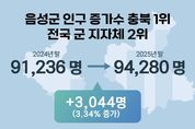 [ 타임즈 - 김시창 기자 ] 지방 소멸 위기 속에서도 충북 음성군이 2025년 한해 괄목할 만한 인구 증가를 기록했다. 지난 12월 31일 기준 음성군의 인구는 9만 4280명으로 전년 대비 3044명이 늘어나며 3.34% 증가율을 보였다. 특히 음성군은 작년 한 해 인구 증가 수에서 충북도 1위를 차지했고, 전국 82개 군 단위 지자체 중에서는 전남 신안군(3685명)에 이어 2위에 이름을 올렸다. 군은 이번 성과의 배경으로 공격적인 기업 투자유치와 활발한 고용 창출을 꼽았다. 민선 7기부터 현재까지 14조 7000억원 규모의 투자를 이끌어내며 지난달 3000억원의 투자협약을 맺은 SPC(주)를 포함 190개 기업을 유치했고 이를 통해 1만 8600개의 일자리를 창출했다. 그 결과 2025년 상반기 고용지표 4개 분야에서 도내 1위, 지역활동인구 11만9700명으로 전국 군 단위 1위 수성은 물론, 지난해 전국 지방자치단체 일자리대상 공시제 부문에서 최우수상을 받으며 5년 연속으로 수상했다. 여기에 주택, 의료, 교육, 생활체육 등 정주 여건의 획기적인 개선도 인구 유입을 뒷받침했다