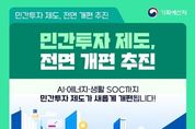 [ 타임즈 - 임성희 기자 ] AI·에너지·생활 SOC까지 민간투자 제도가 새롭게 개편됩니다! 1. 민간투자 제도란? 사회 기반 시설에 대한 민간의 투자를 촉진하여 창의적·효율적으로 사회기반시설을 확충·운영하는 제도 제도 도입 이후 30년 동안 총 872개 사업, 약 154조 원 규모의 민자사업 추진 → AI 등 신산업 분야, 노후시설 성능 개선 등 급증하는 투자 수요에 대응하기 위해서는 재정과 민간투자의 병행이 필수! 2. 이렇게 달라집니다. - 신사업·신유형 확대 - 국민 참여 확대 및 국민 생활 편익 증진 - 지방의 민자 활성화 및 민자사업의 안전 강화 - 절차 단축 등 사업 추진 여건 개선 4대 분야 20개 과제 마련으로 '민간투자의 패러다임 전환' 3. ① 신사업·신유형 확대 AI 데이터센터, 전력망, 철도 복합 시설 등 신산업·신유형 분야에 민간투자 활용 전통적 SOC(도로·철도 등)에서 벗어나 신산업 분야에도 민자 방식을 도입하고, 단순 운영형 민자 신설, 대상지 공모 방식 개선 등으로 신유형 사업 방식을 활성화합니다. ② 국민 참여 확대 및 편익 증진 일반 국