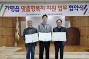 [ 타임즈 - 김시창 기자 ] 가평군 가평읍 행정복지센터는 최근 가평읍지역사회보장협의체(지사협), 유일닭강정과 ‘맞춤형복지 지원 업무협약’을 체결했다. 이번 협약으로 유일닭강정은 매월 가평읍 맞춤형복지팀에서 추천한 저소득계층 10가정에 닭강정을 지원해 주기로 했다. 장석조 가평읍장은 “복지사각지대 발굴뿐 아니라 민간 자원 연계가 복지 수준을 높이는 데 큰 역할을 한다”며 “이번 협약이 공공자원만으로는 충족하기 어려웠던 복지수요를 보완하는 데 큰 도움이 될 것”이라고 말했다. 유병훈 유일닭강정 대표는 “우리 지역 주민들과 마음을 나누고 싶어 맞춤형복지 지원 협약에 참여했다”며 “앞으로도 어려운 이웃을 위한 나눔과 봉사를 꾸준히 실천하겠다”고 밝혔다.