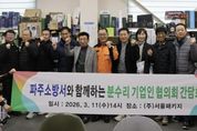 [ 타임즈 - 김시창 기자 ] 파주소방서는 3월 11일 오후 2시 파주시 광탄면 분수리 공장 밀집지역 관계자를 대상으로 안전점검과 간담회를 실시했다. 이날 간담회에는 김명찬 파주소방서장과 예방대책팀장, 광탄119안전센터장 등 소방 관계자, 분수리 기업인 협의회 관계자들이 참석해 공장 밀집지역 화재예방 방안을 논의했다. 분수리 자생산업단지는 약 1.07㎢ 규모에 260여 개 사업장이 밀집해있으며. 약 2천여 명의 근로자가 근무하고 있어 평소 화재예방과 초기 대응체계 강화가 중요한 곳이다. 이에 따라 소방서는 관계자와의 소통을 바탕으로 현장 중심 예방활동을 이어가고 있다. 이날 간담회에서는 산업단지 일반현황과 주요 화재 위험요인을 공유하고, 공장 밀집지역의 특성을 반영한 화재예방 방안을 논의했다. 이후 공단 일대 현지 시찰을 통해 주요 위험요소를 직접 확인하고, 화재 피해 저감 방안을 모색했다. 또 기업 관계자들에게 소화기와 단독경보형감지기 사용법, 전기화재 주의사항, 콘센트 화재 방지 스티커 활용법 등을 안내하고, 파주 관내 기업 대상 오픈채팅방 운영을 소개하며 화재예방 정보 전달 체계도 함께 설명했다. 김명찬