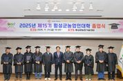 [ 타임즈 - 김시창 기자 ] 횡성군농업인대학은 21일 횡성군농업기술센터에서 ‘2025년 제15기 횡성군농업인대학 졸업식’을 진행했다. 제15기 농업인대학은 지난 2월부터 11월까지 횡성사과, 횡성한우, 미래농업인, 농업경영최고사관CEO 등 4개의 과정을 운영했으며, 총 93회 425시간의 교육을 자체강사와 각 분야의 전문가 등을 초빙해 실습 위주의 현장 중심 교육으로 추진했다. 횡성군농업인대학은 횡성농업의 특화 발전을 위한 품목별 장기 기술교육 기관으로 자리잡고 있으며, 올해는 총 90명의 수료생을 배출했다. 졸업식에는 김명기 군수와 횡성군의회 의장을 비롯해 내빈 및 90여 명의 수료생이 참석했으며, 농촌자원과장의 학사보고를 시작으로 공로상 및 개근상, 성적우수상, 졸업장 수여, 축사, 답사, 기념촬영 순으로 진행됐다. 김명기 횡성군수는 “졸업생들이 오늘의 성취를 바탕으로 더 큰 도전과 성장을 이어가길 바라며, 앞으로도 농업·농촌이 미래 경제성장 동력으로서 지속적으로 발전할 수 있도록 다양한 농업인교육을 추진하겠다”고 말했다.