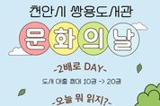 [ 타임즈 - 김시창 기자 ] 천안시 쌍용도서관은 매달 마지막주 수요일 ‘2026 문화가 있는 날’ 행사를 운영한다고 16일 밝혔다. 쌍용도서관은 올해 문화가 있는 날에 1인당 20권의 책을 빌릴 수 있는 ‘2배로 Day’와 블라인드 도서 대출 행사 ‘오늘 뭐 읽지?’를 운영한다. 자세한 사항은 쌍용도서관으로 문의하면 된다. 쌍용도서관 관계자는 “문화가 있는 날 행사를 통해 시민들이 독서에 관심을 갖게 되는 계기가 되길 바란다”며 “도서관 이용의 활성화를 기대한다”고 말했다.