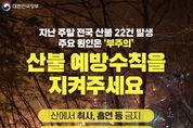 [ 타임즈 - 임성희 기자 ] 지난 주말 전국 산불 22건 발생 주요 원인은 '부주의' 산불 예방수칙을 지켜주세요 · 산에서 취사, 흡연 등 금지 · 산 근처에서 쓰레기 소각 금지 · 연기, 불씨 보면 119 신고 "불법소각, 꽁초 투기 등 위반 행위 엄정 대응"